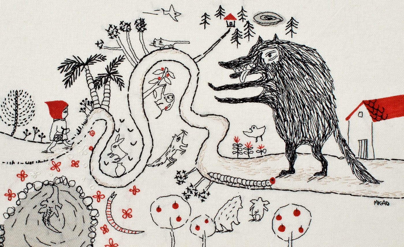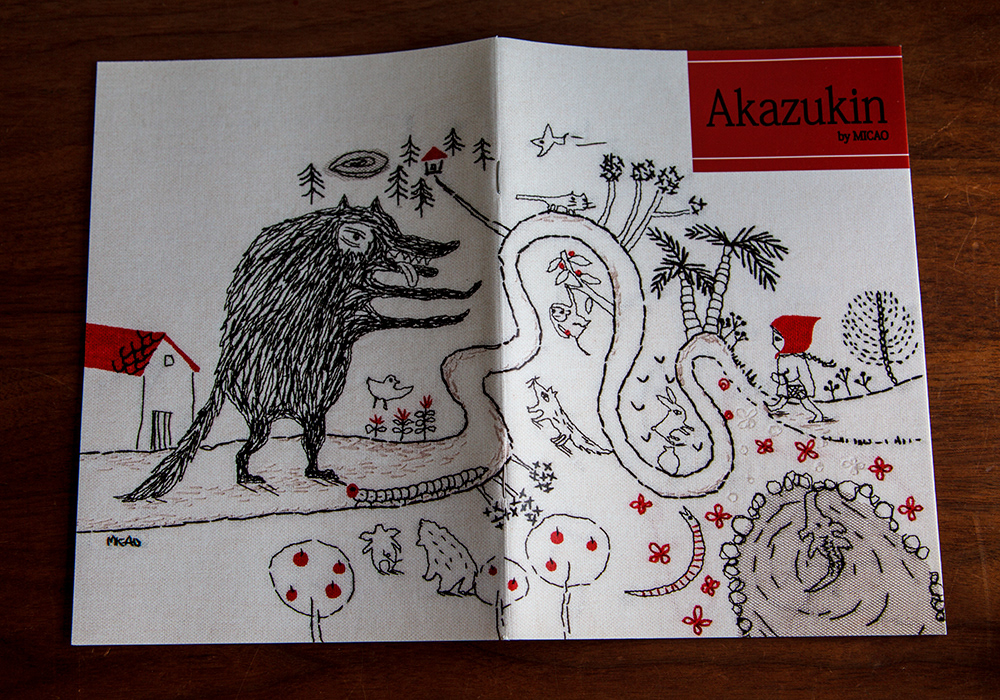 Akazukin is a embroidered picture book based on Grimm's Fairy Tales.